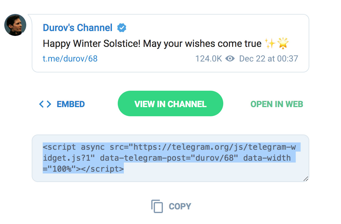 You can embed messages from public groups and channels anywhere. Here’s what an embed of a Telegram message looks like when included on a web page: